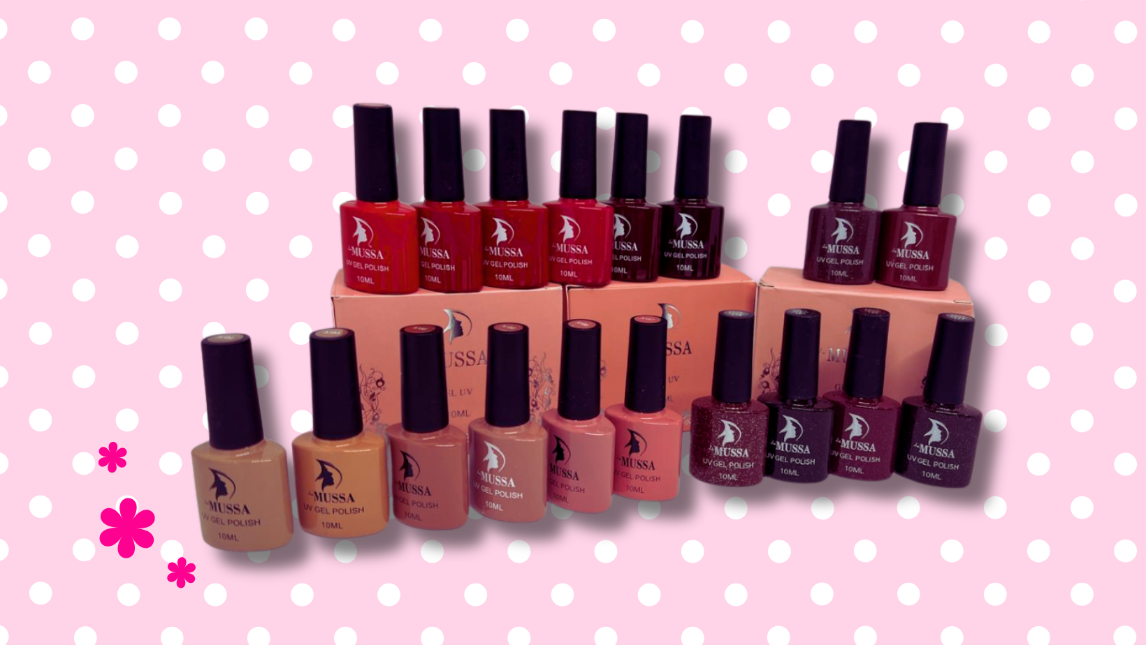 ¡3 Gamas de geles MUSSA, en total son 18 tonos! *Las gamas son elegidas aleatoriamente según existencias.