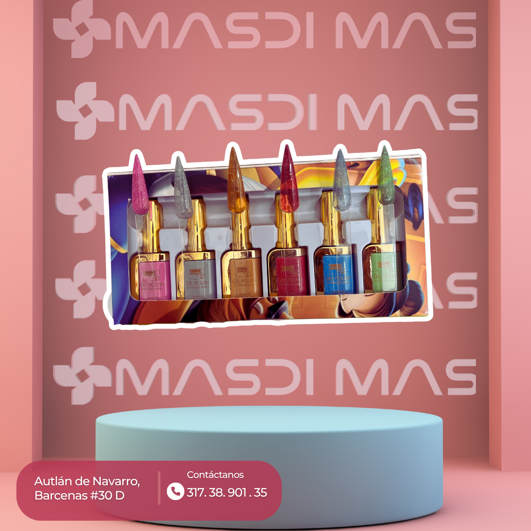 Gama Bella, colección de 6 geles fotosensibles en tonos rosa, gris, dorado, rojo, azul y verde
