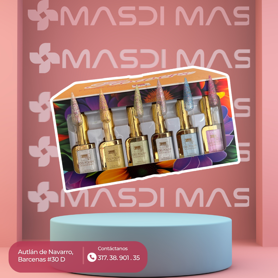 Gama Flower, Colección de 6 geles ultra brillantes en tono blanco, amarillo, lima, tornasol, azul y rosa