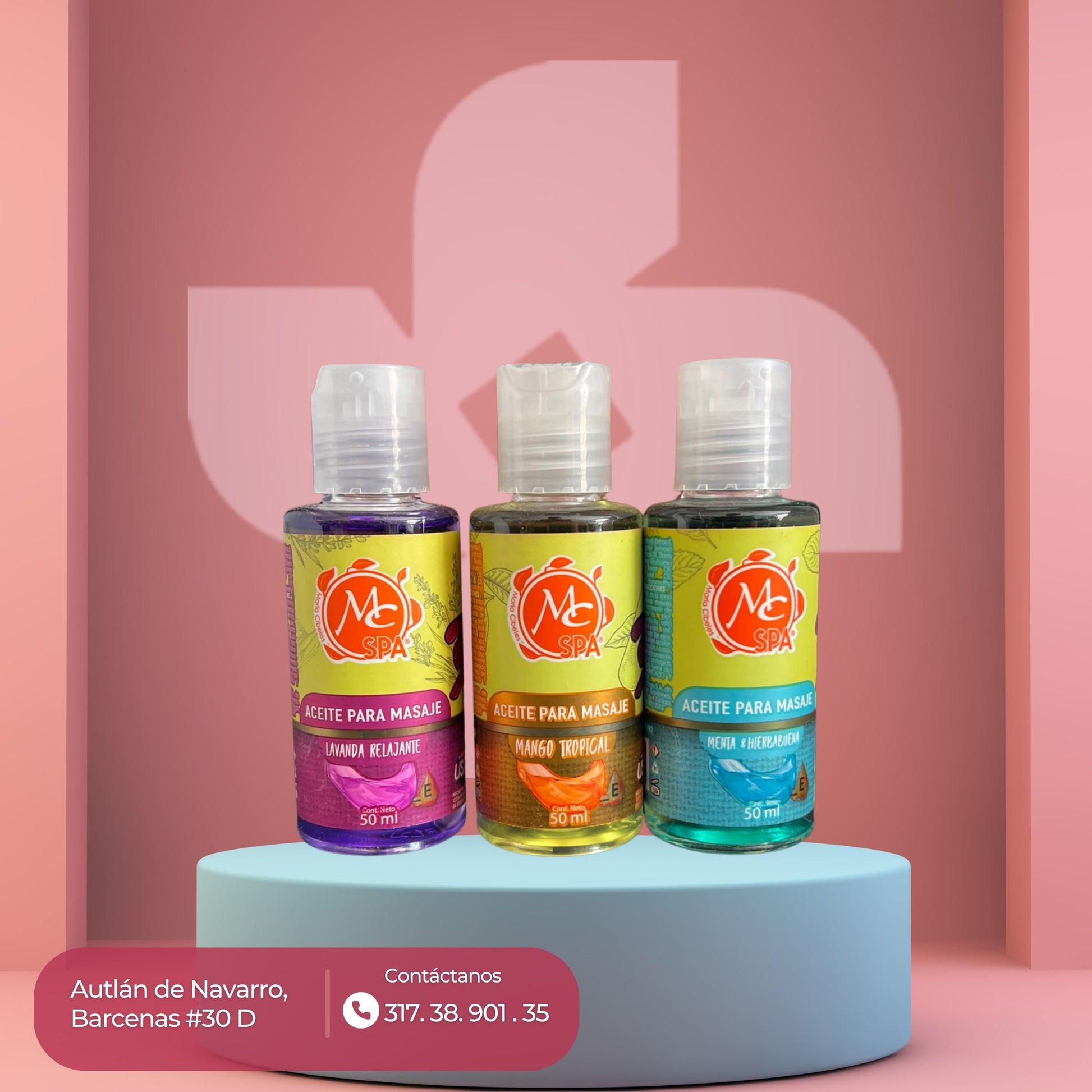 KIT PARA MASAJES MC INCLUYE 3 ACEITES: LAVANDA RELAJANTE, MANGO TROPICAL Y MENTA HIERBABUENA
